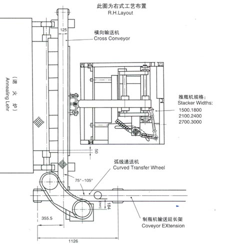 該機(jī)組是我廠在1988年消化吸收西德派尼康姆公司的技術(shù)制造的,具有國際九十年代先進(jìn)水平,可與QD4A、QD6A、QD6C、QD8A、QD8D等單滴料制瓶機(jī)和六組 、八組、十組、十二組、雙滴料制瓶機(jī)配套使用;與供料機(jī)、制瓶機(jī)保持嚴(yán)格的同步運(yùn)行,將玻璃制品連續(xù),等距離地自動排列,避免碰撞,倒伏,磨擦現(xiàn)象,有效地提高玻璃制品的合格率,并保證其退火質(zhì)量,為冷端噴涂提供了良好的條件,該機(jī)組適用于任何形式任何規(guī)格的退火爐,尤其適用于電加熱的退火爐。